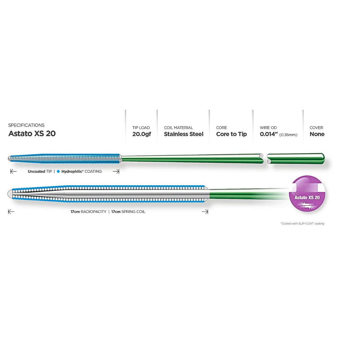 | Astato XS 20 | PAGH143092 | Straight | 180cm | 0.20/0.36mm (0.008/0.014″) | Hydrophilic (Uncoated Ball Tip) | 17cm | 20gf | 17cm | 17cm |