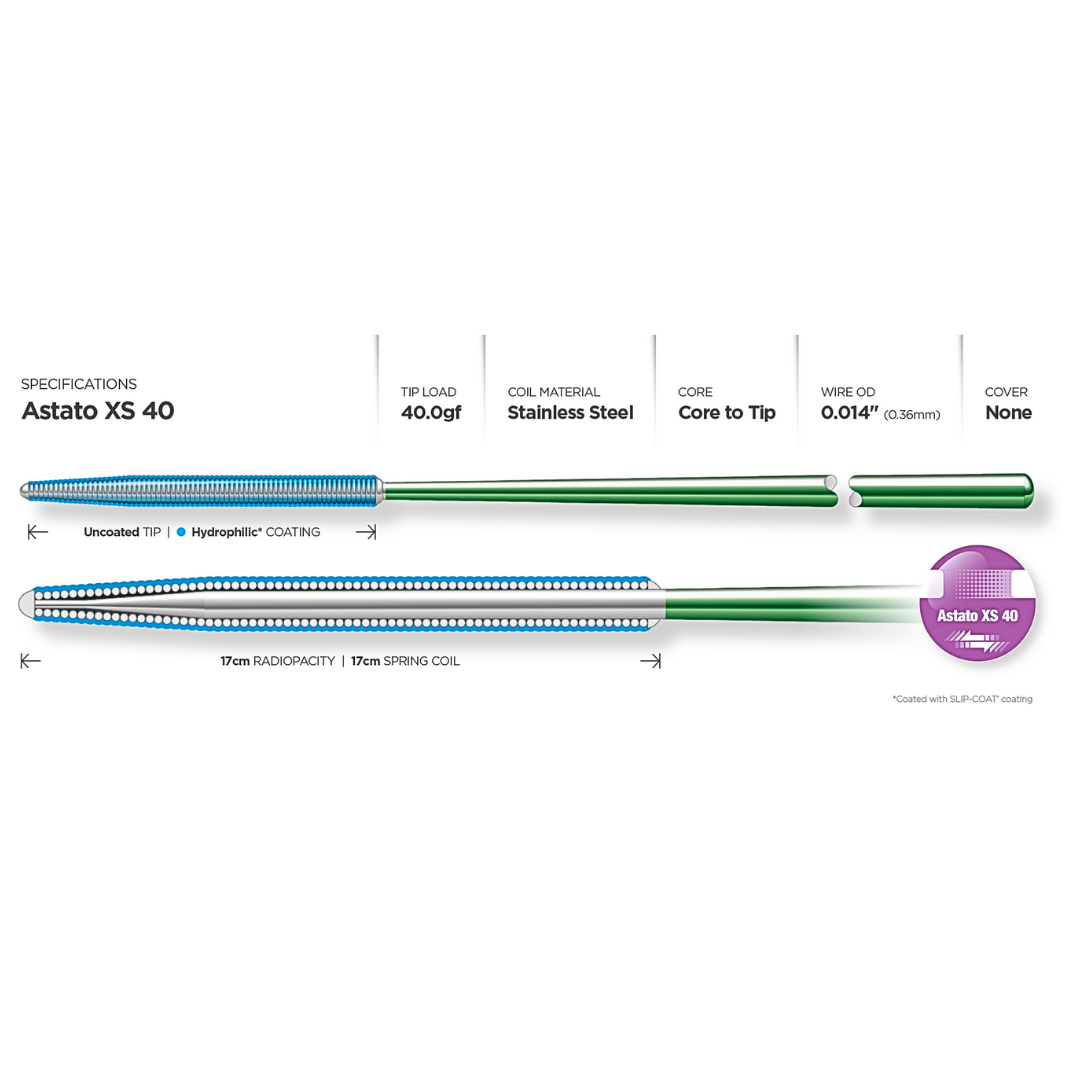 | Astato XS 40 | PAGHW143094 | Straight | 200cm | 0.23/0.36mm (0.009/0.014″) | Hydrophilic (Uncoated Ball Tip) | 60cm | 40gf | 20cm | 20cm |